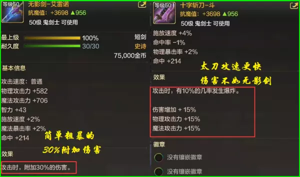 而反观十字斩刀,极快的攻击速度,附加10%几率爆炸,伤害增加15%,双攻+10%,虽然整体伤害不如无影剑,但其实差距不算太大,而太刀的实战体验比短剑要好很多,所以更加推荐十字斩刀。
